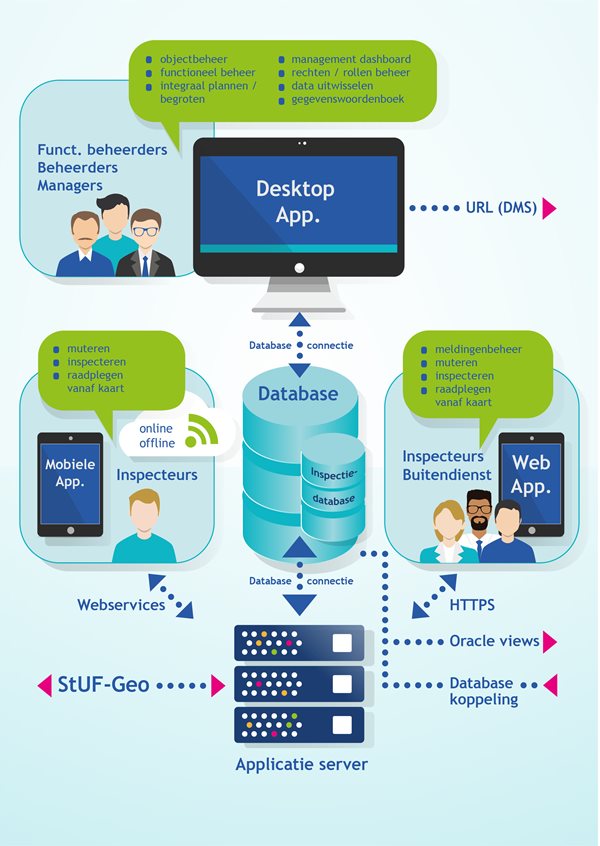 Het integrale beheersysteem gisib is een client-server applicatie volgens het 3 lagen (3-Tier) model. Dit houdt in dat de programmatuur op een andere server staat dan de database. De programmatuur gisib (client) communiceert rechtstreeks met de database (server). De server neemt de verwerking van de data voor haar rekening. Het client-server model heeft veel voordelen ten opzichte van bijvoorbeeld een webapplicatie.